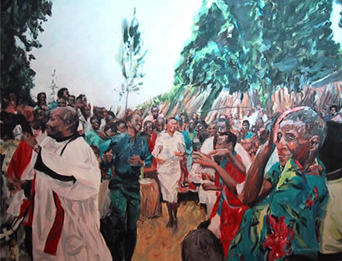 This series of paintings was inspred by Kim's recent visit to Uganda where she stayed in a village near Kibale. Kibale is located in the South West corner of Uganda. All paintings are oil on canvas and are about 700mm x 450mm. The collection is framed and for sale at a price of £1,250 each.